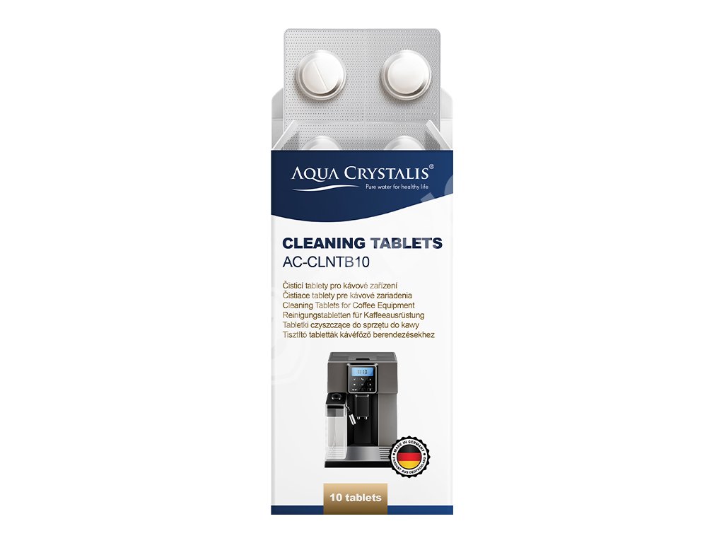 - 1× Aqua Crystalis AC-CLNTB10 (10×2g) – čisticí tablety pro odstranění mastnoty a kávových olejů z vnitřních částí přístroje. Vhodné pro automatické a poloautomatické kávovary.